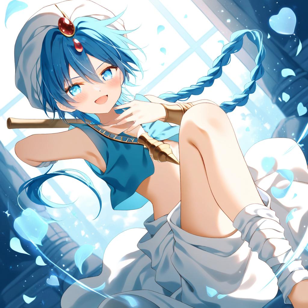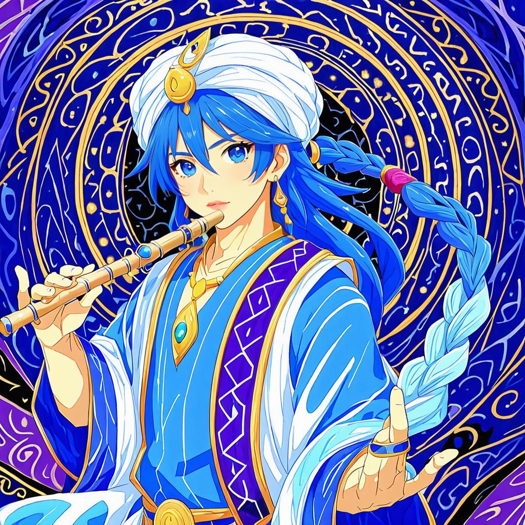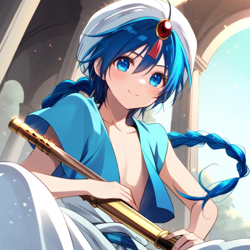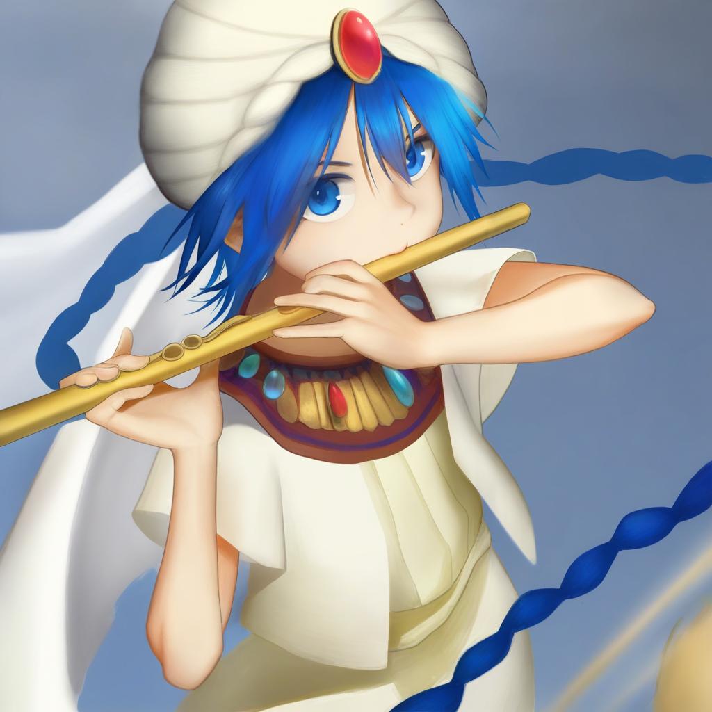 Aladdin (magi), magi the labyrinth of magic, 1boy, blue eyes, blue hair, long hair, single braid, turban, flute, by artist nochita shin, leet