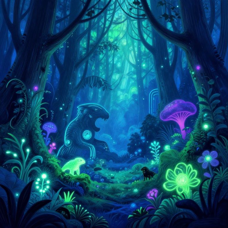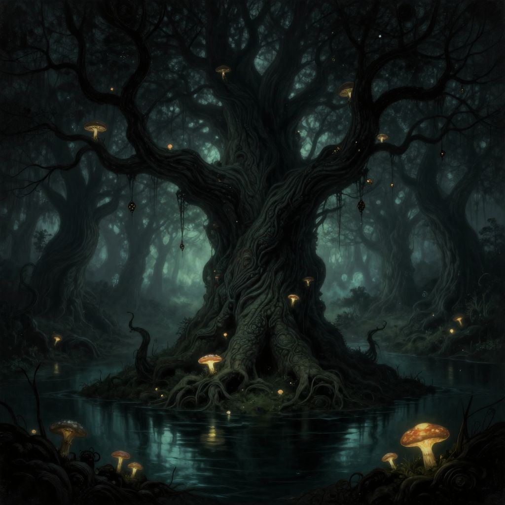 Black-and-white digital drawing of a forest with twisted trees, fairy-like creatures, and a wolf. Text "Silvanus" and "Lumin