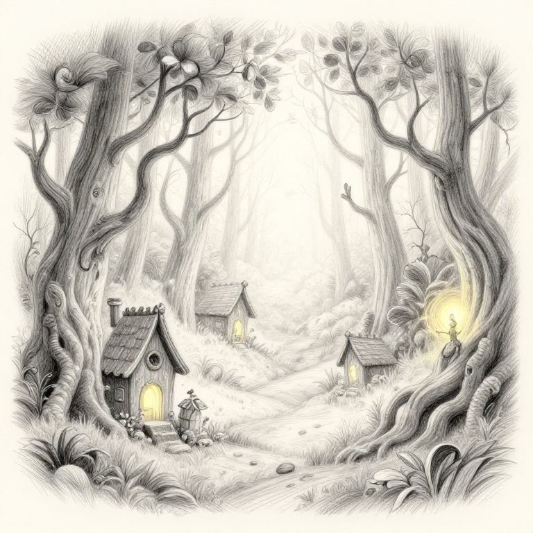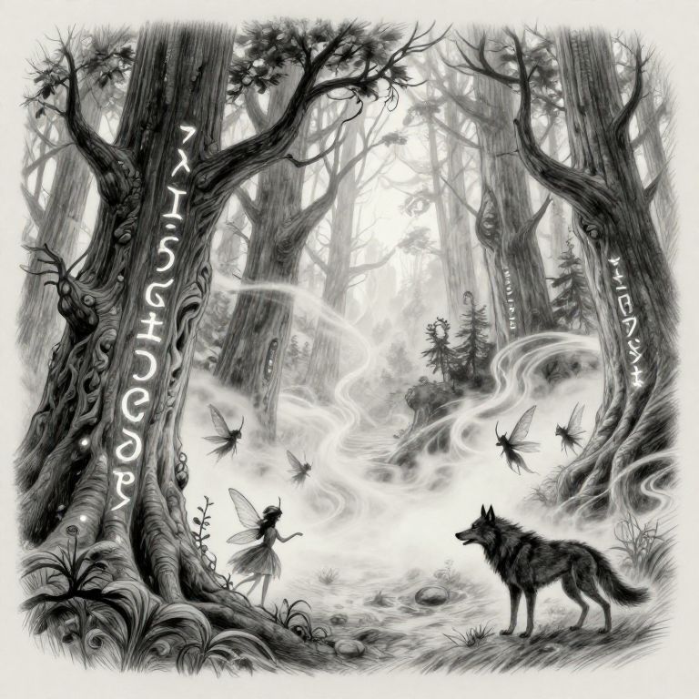 Fantasy sketch ideas featuring a mysterious ancient forest with glowing magical runes etched into twisted tree trunks, ethereal mist swirling around, and mythical creatures like faeries and shadow wolves lurking in the depths, rendered with delicate pencil strokes.