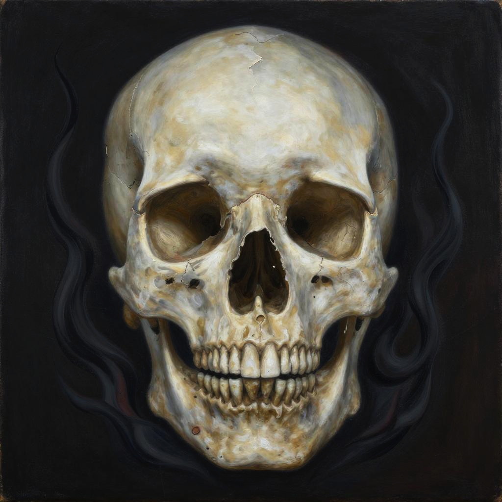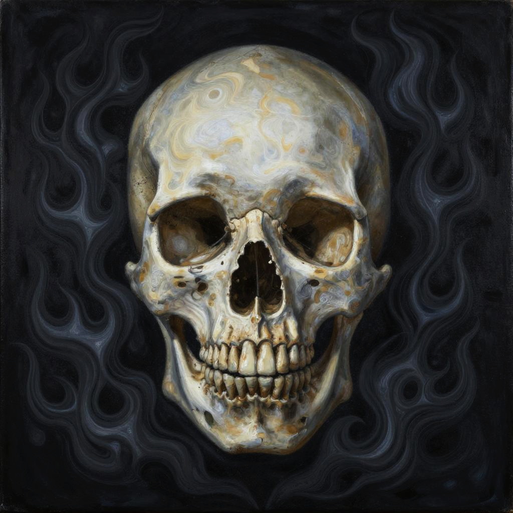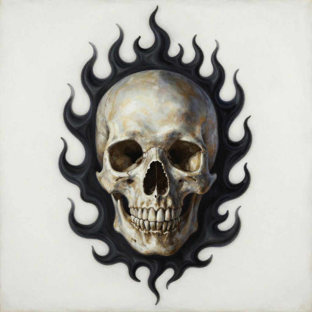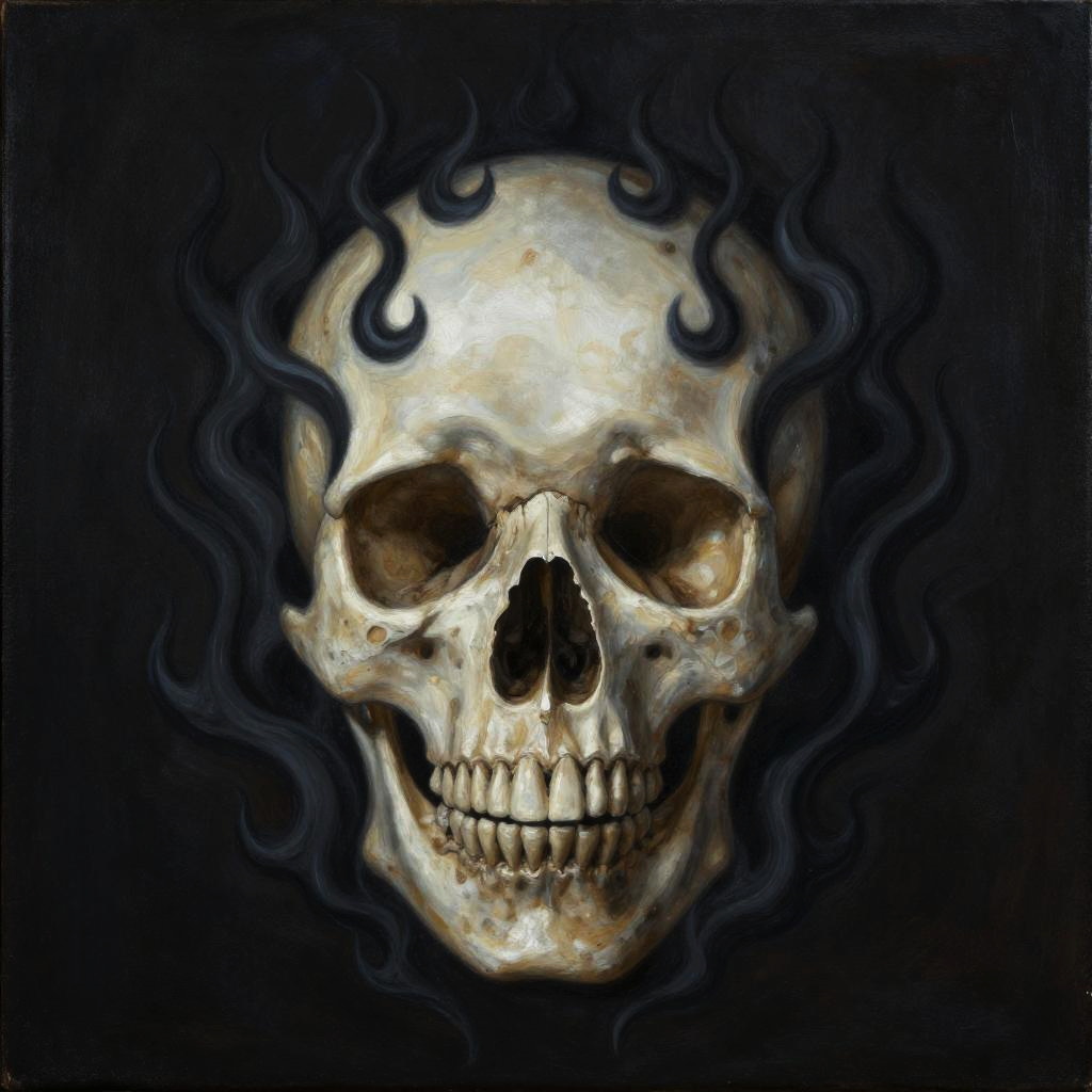 Chilling symmetrical painting by Michael Hussar depicting a skull entwined with ethereal black flames, balanced composition expressing existential anguish, dark and chilling atmosphere, highly detailed and emotionally intense
