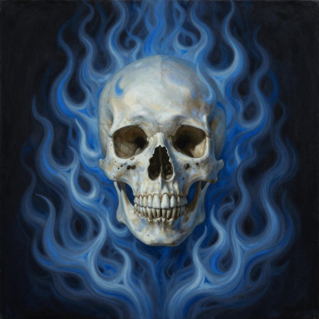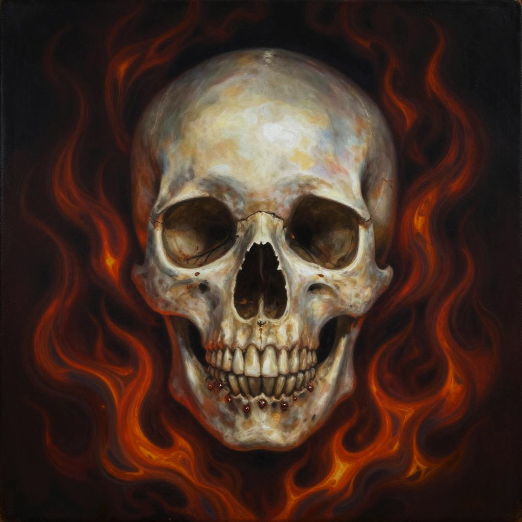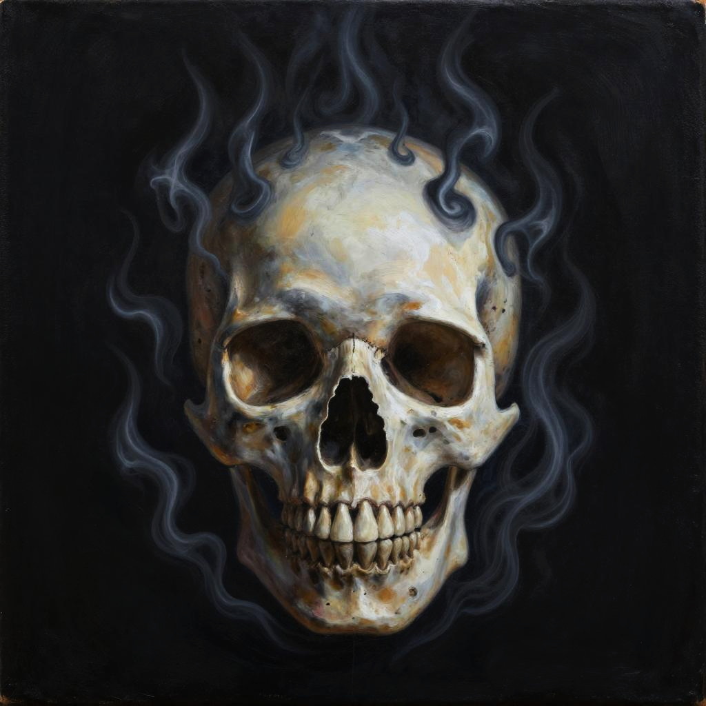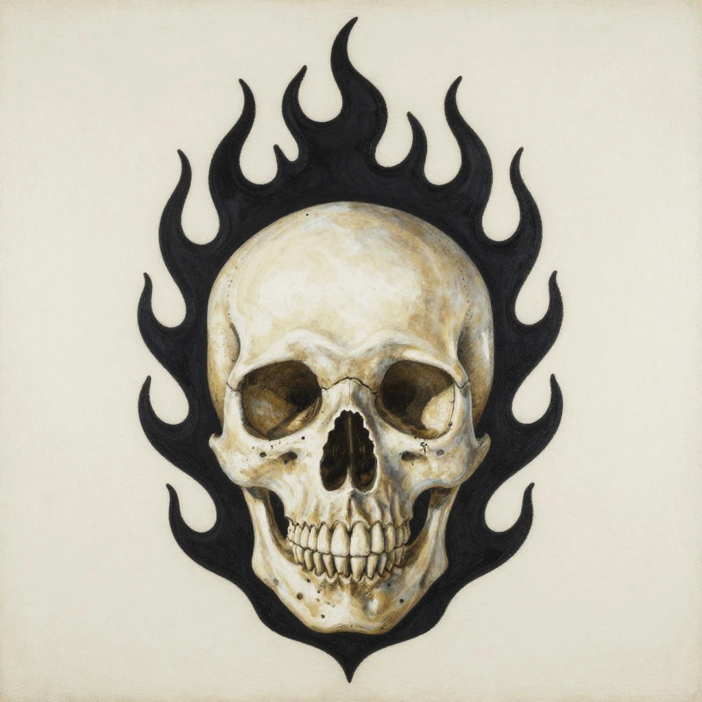 Chilling symmetrical painting by Michael Hussar depicting a skull entwined with ethereal black flames, balanced composition expressing existential anguish, dark and chilling atmosphere, highly detailed and emotionally intense