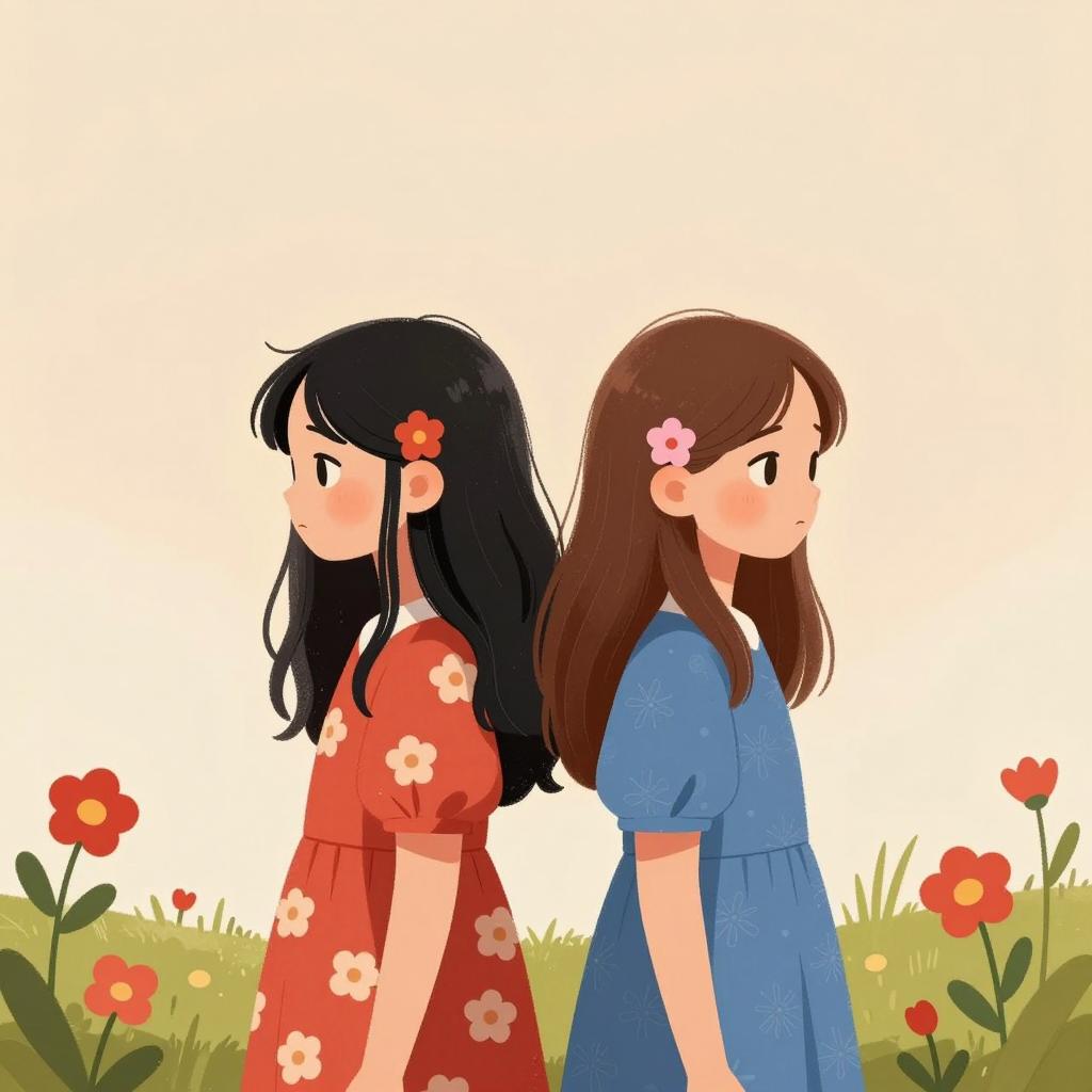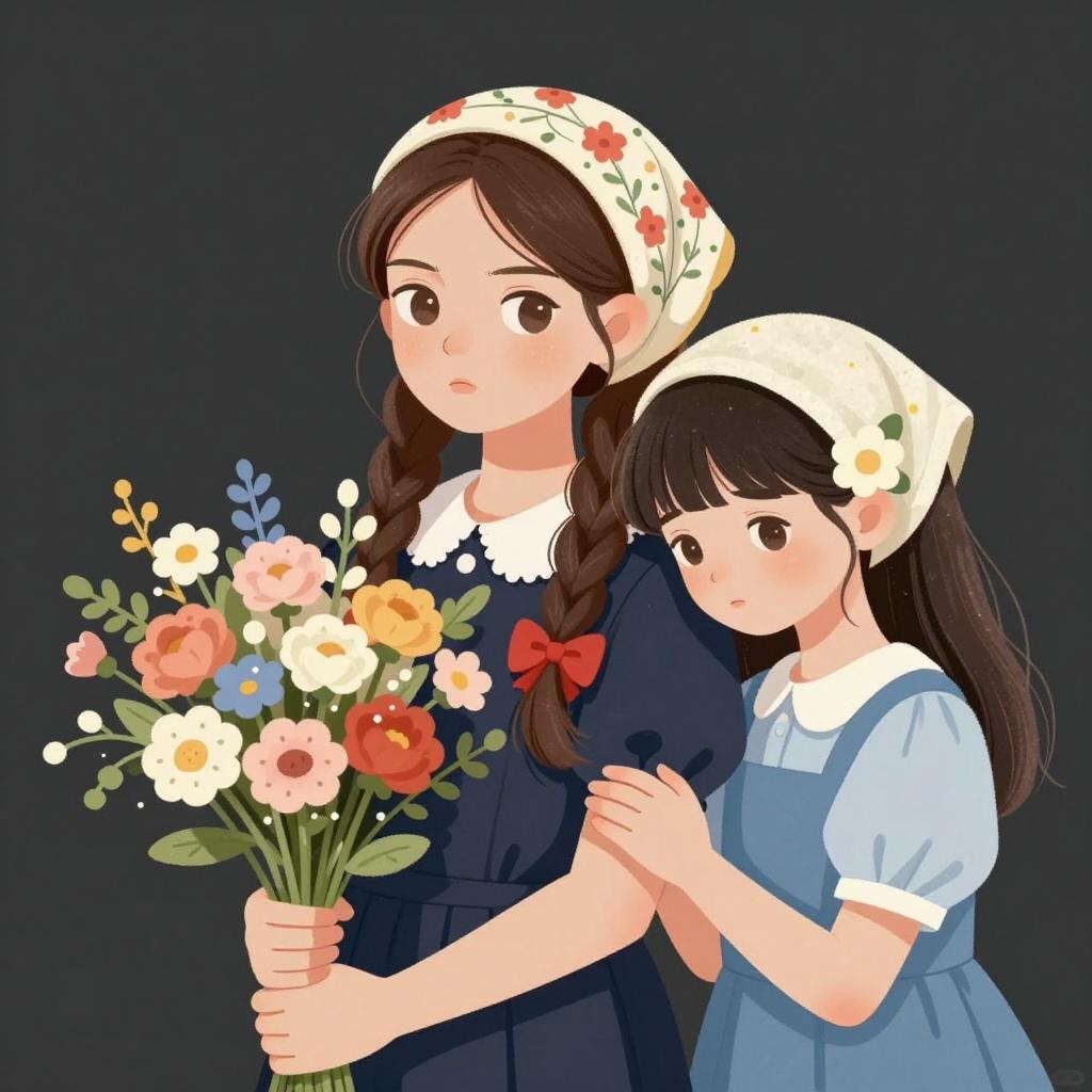 Digital illustration of two young girls against a dark background. The older girl has long brown braids tied with a red bow and wears a dark blue dress with a white collar. She is holding a colorful bouquet of flowers and wears a floral headscarf. The younger girl, with long dark hair adorned with a white flower and a cream headscarf, wears a light blue dress and leans on the older girl's shoulder with a sad expression.