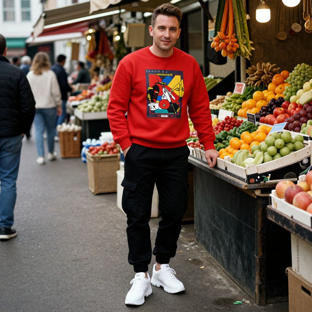 A man, bold graphic sweatshirt in bright red, tapered black cargo pants, chunky white trainers, vibrant stalls, colorful produce, bustling crowds, vintage photo style, leaning against a stall, confident smile.Man has masculine face and piercing eyes