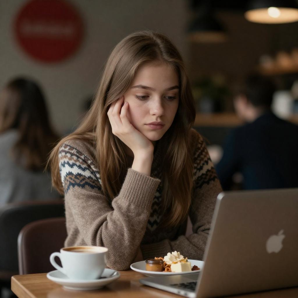 A young woman with long, straight light brown hair and fair skin wearing a patterned brown sweater sits at a wooden table in a dimly lit café. She rests her head on her hand, looking thoughtful, while working on a silver laptop. On the table are a white cup of coffee on a saucer, a plate with a dessert, and a small jar. The background is softly blurred, showing other café patrons and warm lighting.