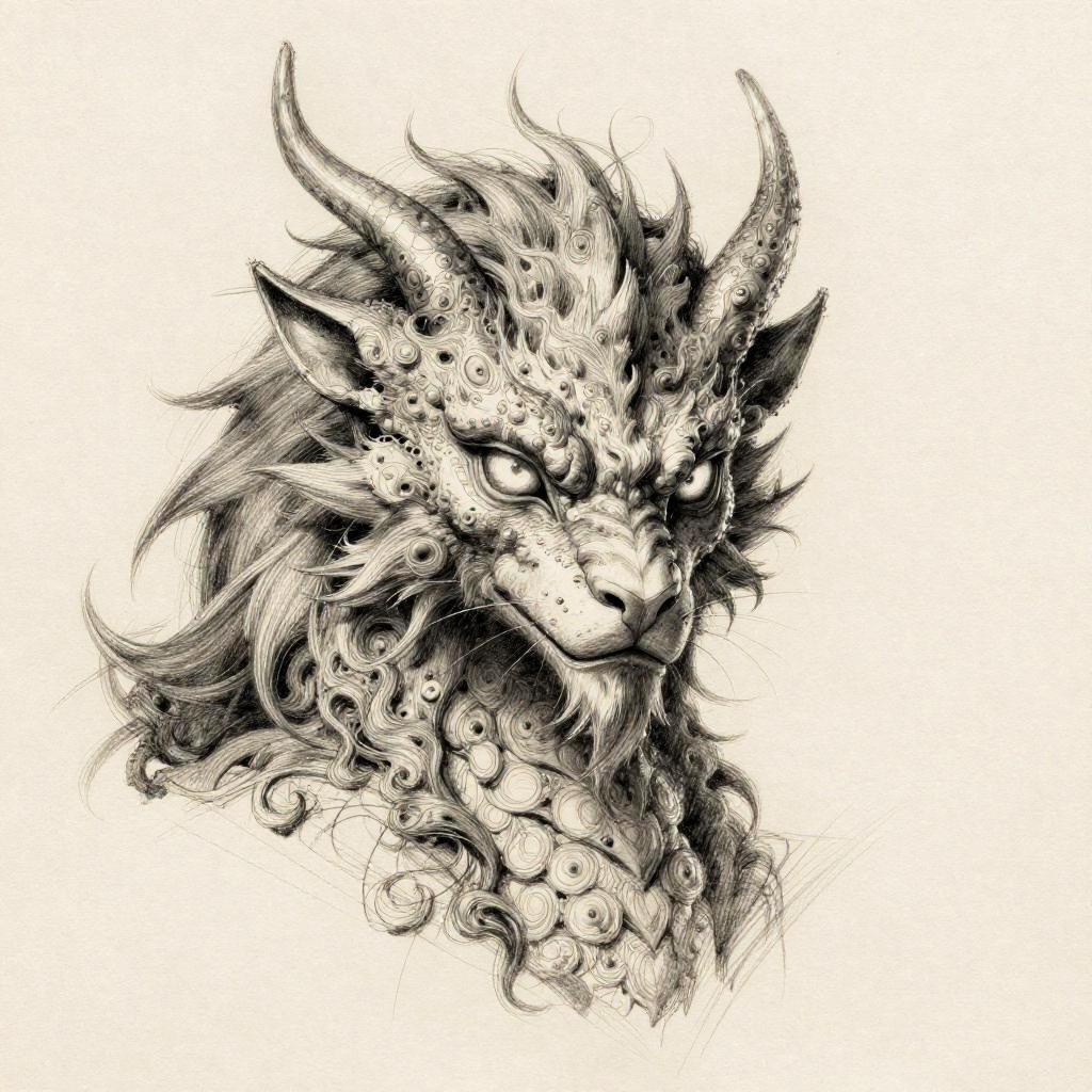 Sketch generator AI producing a portrait of a mythical creature with elaborate pencil strokes, showcasing textured fur and glowing eyes, merging traditional sketching techniques with advanced AI artistic flair on a textured paper background.