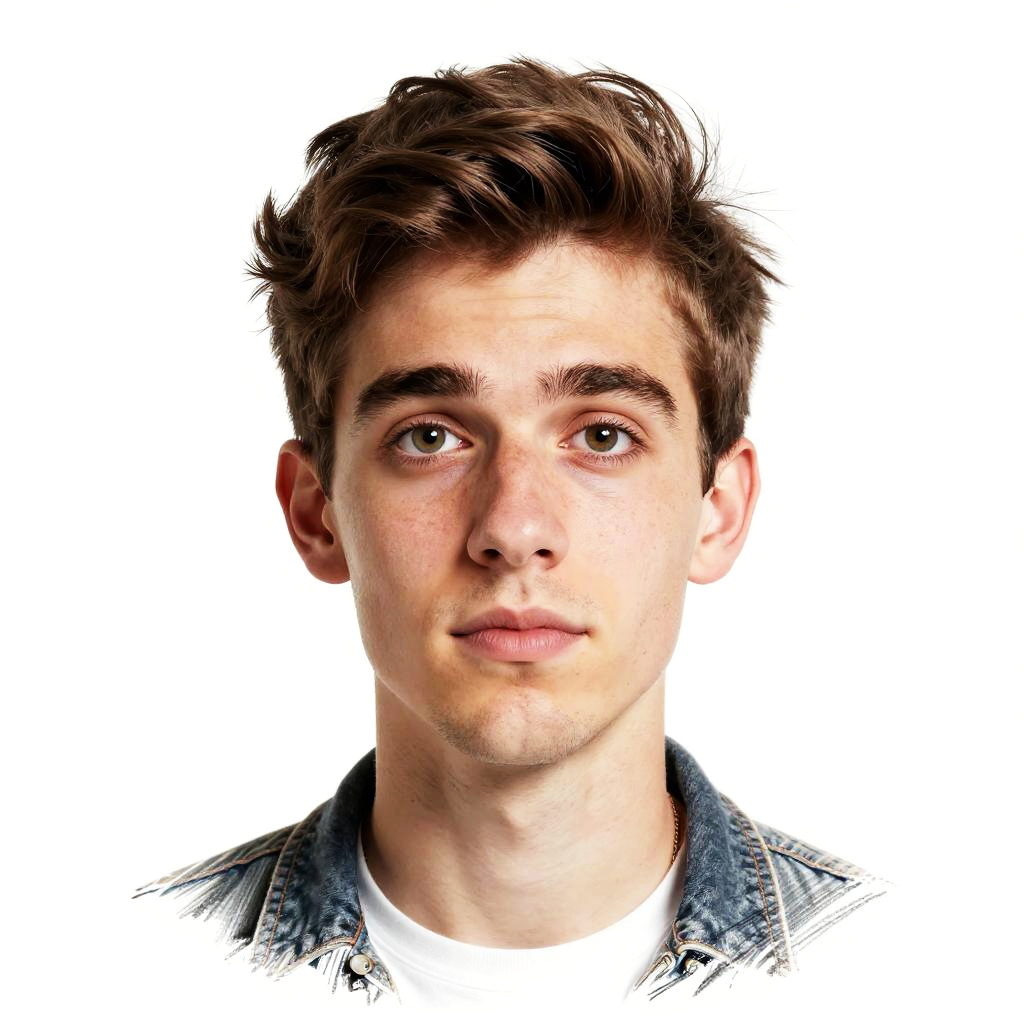 Buzz cut white man in a professional setting, smart casual outfit, clean white background with soft shadows, focused expression, balanced composition, photographic realism with detailed hair, skin texture, and subtle color grading emphasizing the buzz cut.