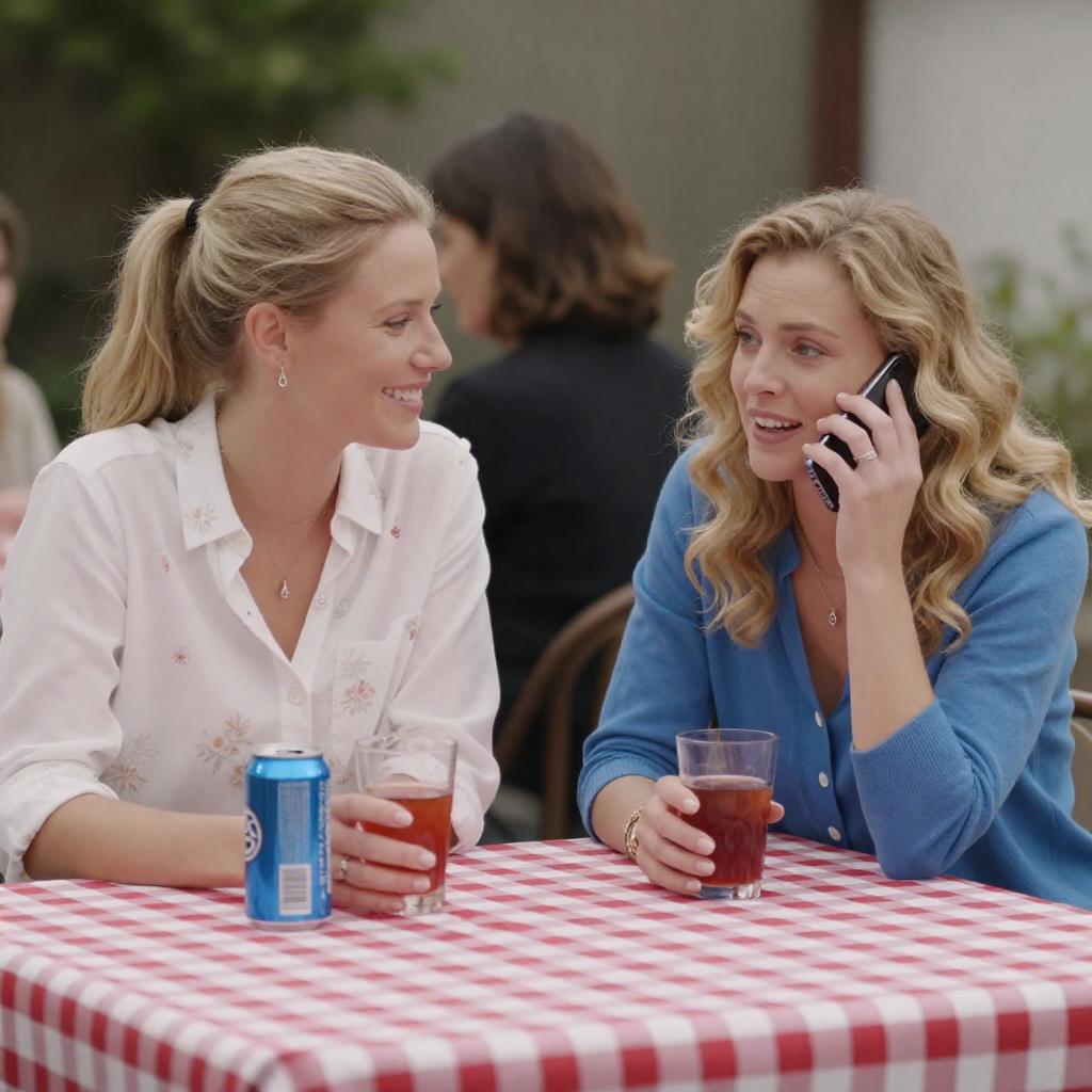Photograph of two women at an outdoor table with a red and white checkered tablecloth. The woman on the left, with blonde hair in a ponytail, wears a white floral shirt and smiles. The woman on the right, with blonde, wavy hair, wears a blue cardigan and talks on a cellphone while holding a glass of red drink. A blue can and another glass are on the table. A third woman in a black top is partially visible in the background.