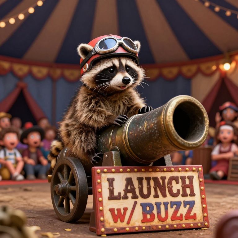 Photograph of a cute, cartoon-style raccoon with black and white fur, wearing aviator goggles and a red helmet, operating a vintage cannon. The raccoon is perched on a wooden cart with large wheels, holding the cannon's barrel. A sign in front reads "LAUNCH W/BUZ" in bold letters. The background shows a circus tent with blue and red stripes and blurred audience members. The image has a colorful, vibrant, and whimsical feel, with exaggerated features and playful elements.