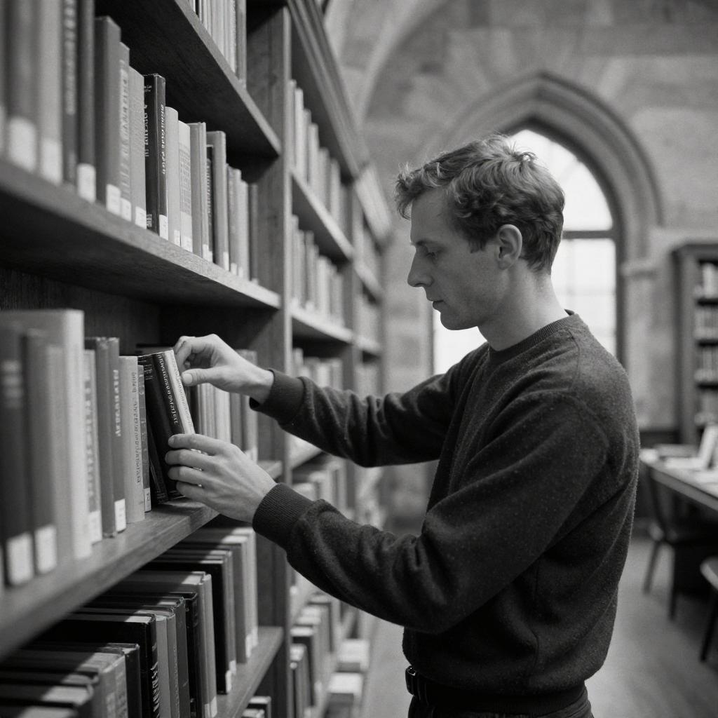 Black-and-white photo of a serious, handsome man with dark hair in a plaid suit, standing in a busy city street surrounded by people in suits