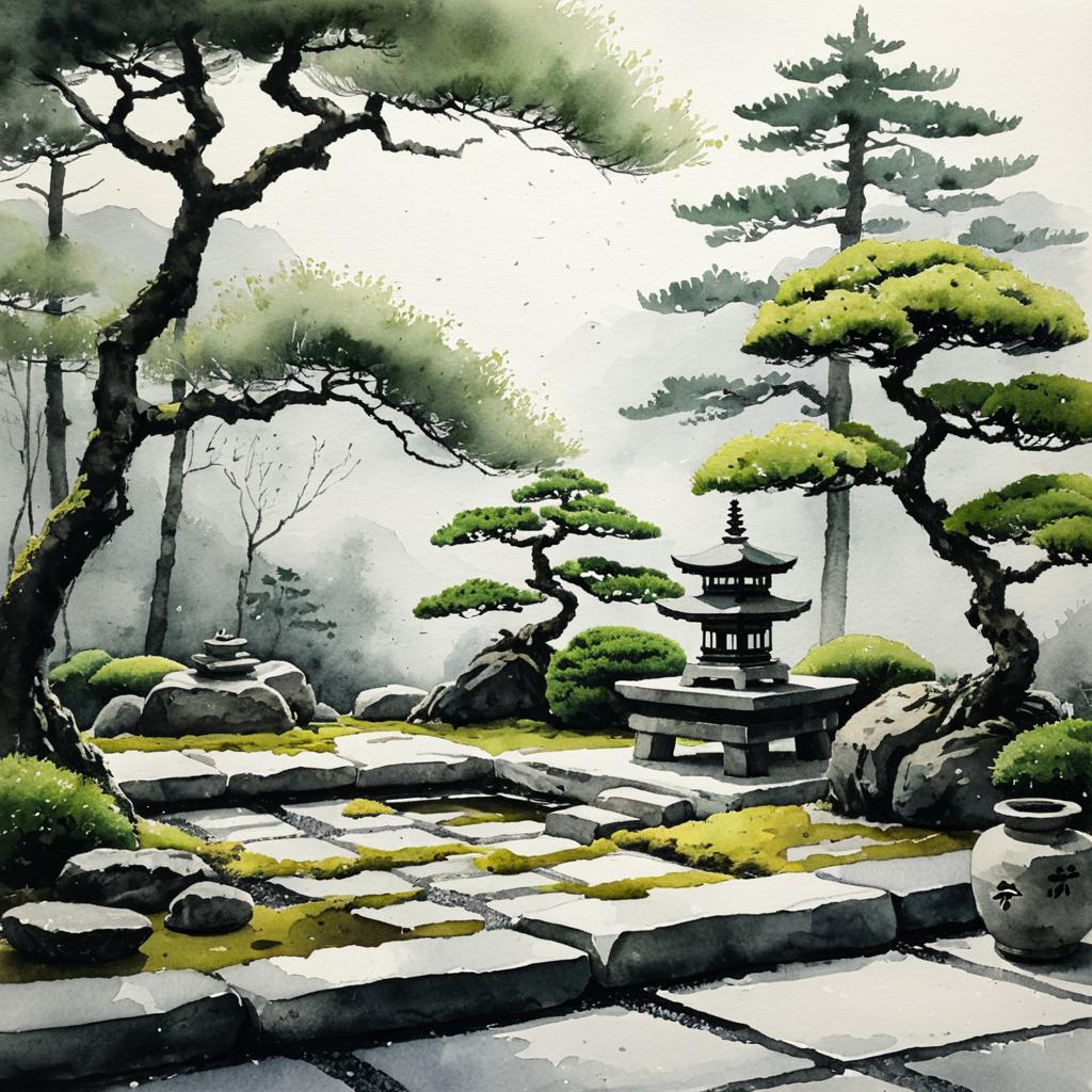 Watercolor painting of a tranquil Japanese zen garden featuring stone lanterns, bonsai trees, moss-covered stones, and a minimalist soft brushstroke style in subdued grey and moss green tones. The scene evokes a peaceful and serene aesthetic.