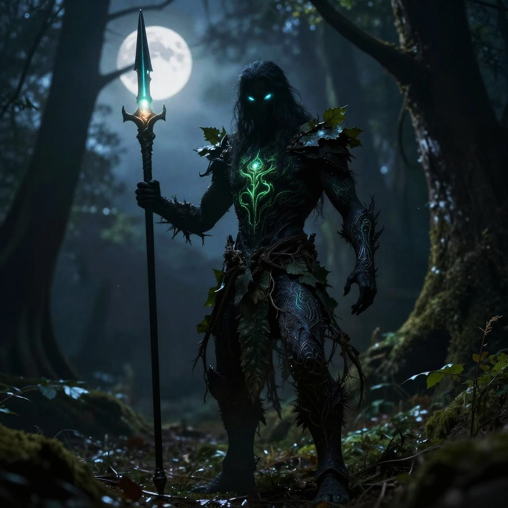 A dark, digital fantasy artwork of a silhouetted, mystical warrior with glowing blue eyes and intricate, bioluminescent green patterns on their chest and armor. The figure holds a tall, ornate spear with a glowing blade in their right hand. They wear tattered, thorny armor adorned with green leaves. The background is a dense, moonlit forest with tall trees and a bright full moon partially obscured by fog. The forest floor is covered in moss and small plants, adding texture and depth to the scene. The overall atmosphere is eerie and magical.