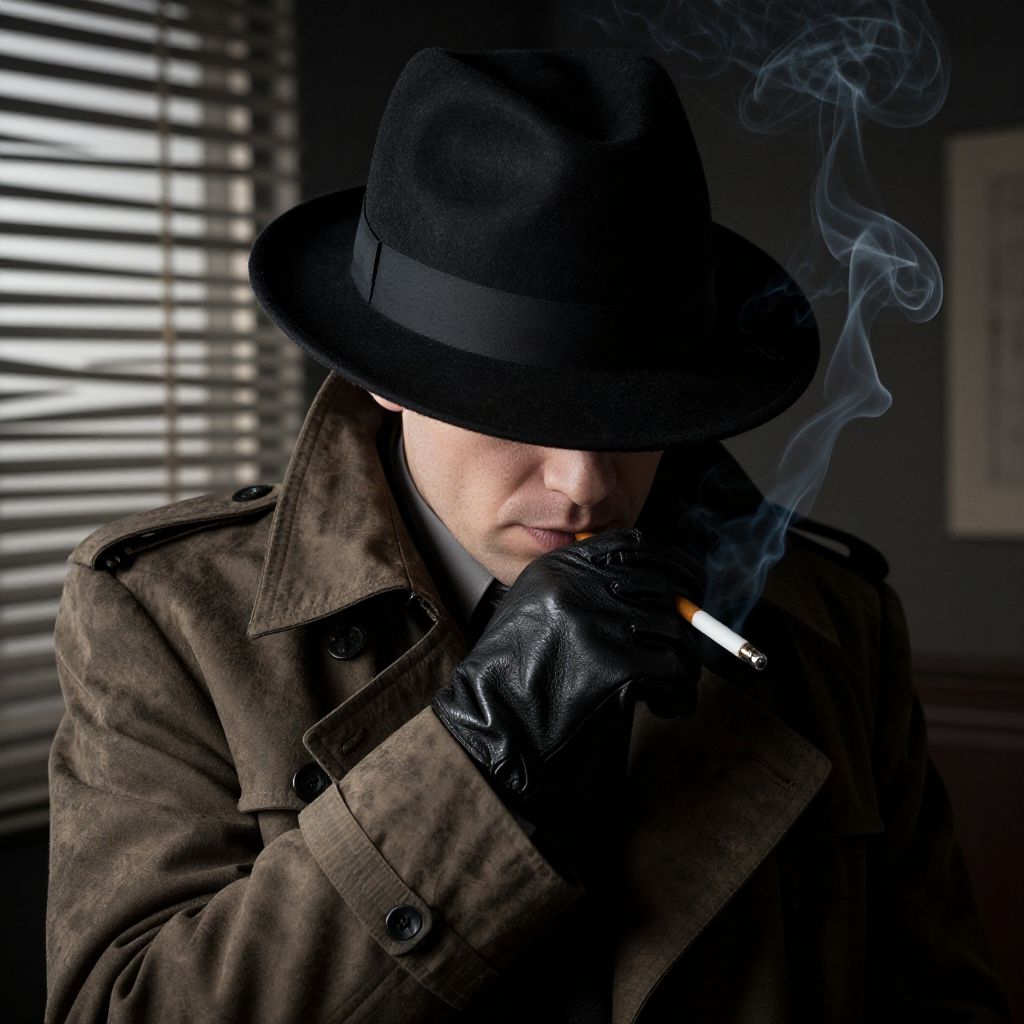 Mysterious man in black fedora, brown trench coat, black gloves, smoking cigarette, with swirling smoke, illuminated by window blinds.