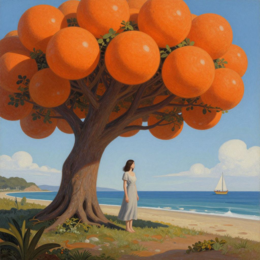 A surreal digital artwork featuring a woman standing beneath a fantastical tree adorned with vibrant orange orbs, set against a serene coastal landscape with sailboats on the horizon, evoking the dreamlike and illusionary style reminiscent of Rob Gonsalves' surrealist paintings.