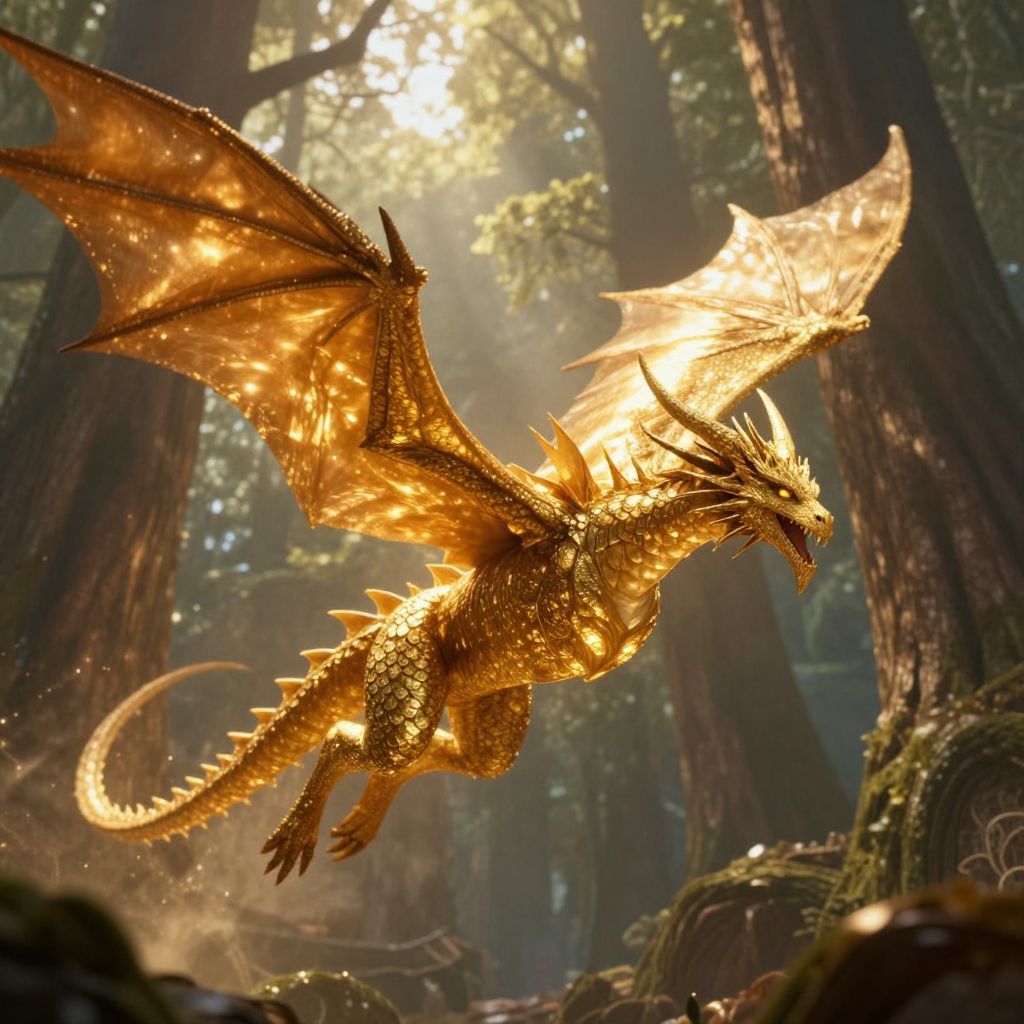 Glowing golden dragon with intricate scales and translucent wings flying through a sunlit forest, sunlight filtering through tall trees. Photorealistic CGI.