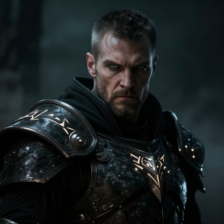 Photograph of a serious, muscular Caucasian man with short brown hair and a beard, wearing dark, ornate, medieval-style armor with intricate, glowing patterns. His intense blue eyes are focused forward, and his expression is stern. The background is blurred and dark, enhancing the dramatic lighting that highlights his armor's reflective surfaces. The image has a high-contrast, cinematic quality, with a dark, moody atmosphere. The armor's metallic textures and the man's determined look suggest a warrior or knight in a fantasy or historical setting.