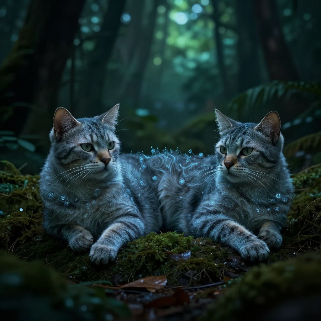 AI generated cats lounging in a mystical forest rendered with hyper-realistic detail, their fur composed of flowing digital pixels and fractal patterns, ambient light filtering through thick foliage, creating a mysterious and enchanting atmosphere of nature meets artificial intelligence.