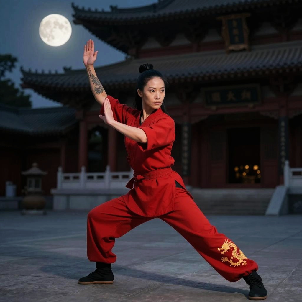 Photograph of an Asian woman in a red martial arts uniform, performing a kung fu stance at night, with a full moon and traditional Chinese temple