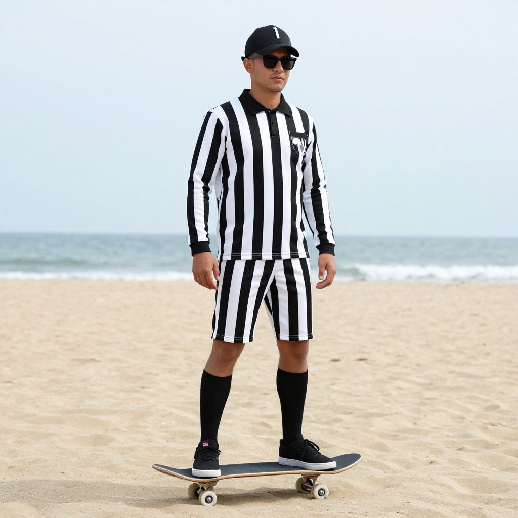 Referee Costume, man standing on a skateboard on a beach