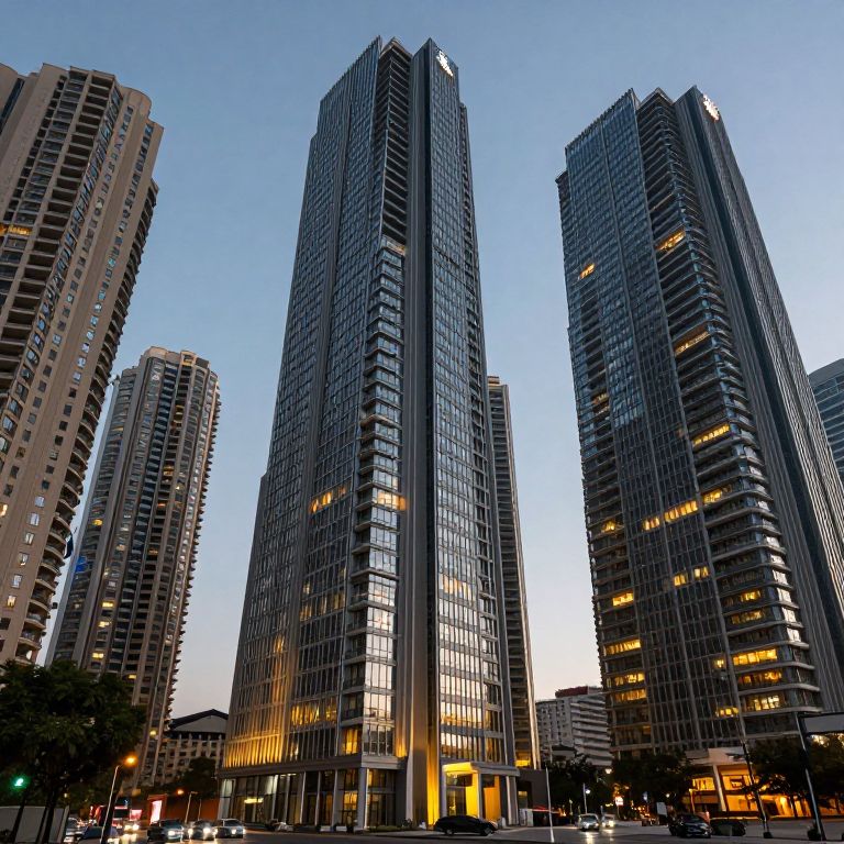 Photograph of tall, modern skyscrapers with reflective glass windows, illuminated by yellow lights, against a clear blue evening sky.