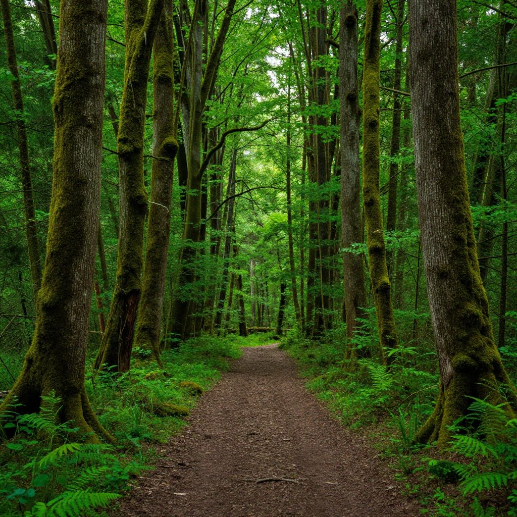 A vibrant green forest featuring tall trees with moss-covered trunks and forest floor. A narrow dirt path winds through the dense woodland, creating a serene and natural atmosphere. The light filtering through the canopy emphasizes the lush moss and foliage.
