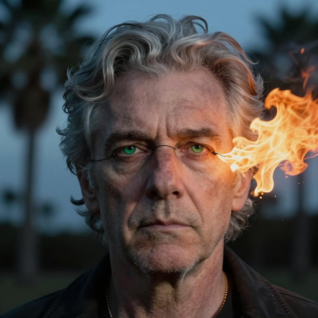 Portrait of a middle-aged man with wavy gray hair and green eyes, pale skin, and a serious expression. His left eye is partially obscured by a thin black wire attached to a bright burst of orange and yellow flame on the right side. The background features an out-of-focus dark blue sky and palm trees, suggesting an outdoor setting during dusk or early evening.