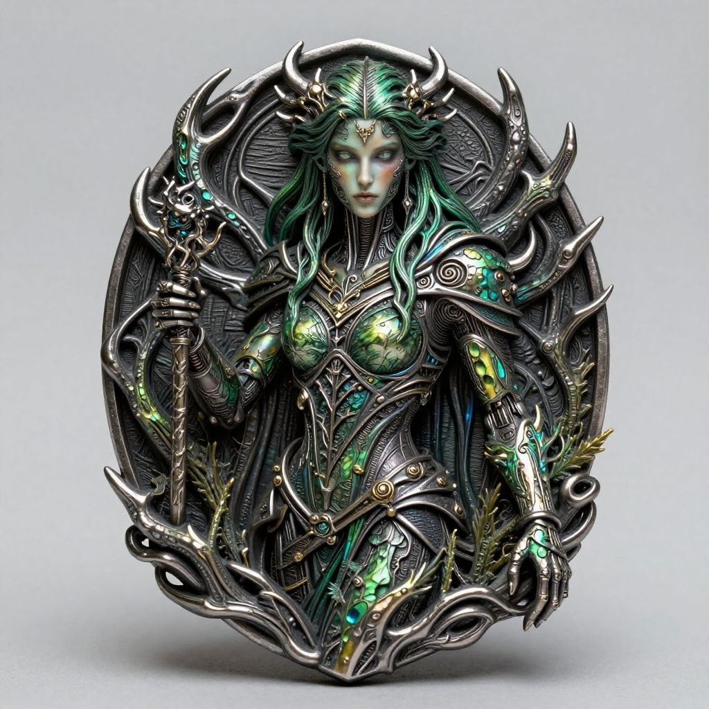 Metal trinket depicting a Druid - A magic-user with a deep connection to nature, able to shape-shift and command natural forces. Julia Pishtar, natural, shimmering, vibrant, gothic, rpg, 1400ad, ultra detailed, detailed, immersive, reminiscent of high fantasy RPG games, HD, masterpiece, best quality, hyper detailed, super realistic, perfect face, perfect hands, award-winning, professional, breathtaking, linquiveraverdant Forestdisturbed weatherbiomechanical cyberpunk . cybernetics, human-machine fusion, dystopian, organic meets artificial, dark, intricate