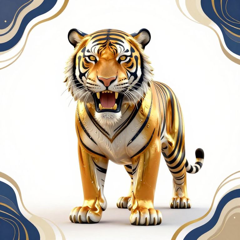 The image is a stunning 3D render of a tiger, rendered in a futuristic style with a high contrast between liquid gold color and dark blue and cream accents. The tiger's head is prominently featured, with its mouth open in a roar, creating a dynamic and powerful visual. The background is a bright white #ffffff, providing a stark contrast that highlights the tiger's intricate details. The composition is balanced, with the tiger positioned centrally, surrounded by abstract, flowing lines that add a sense of motion and depth. The negative space is used effectively to emphasize the tiger's form, while subtle retro-inspired motifs add a vintage touch to the otherwise modern design. The overall effect is a harmonious blend of futuristic and vintage elements, creating a visually striking and engaging image.