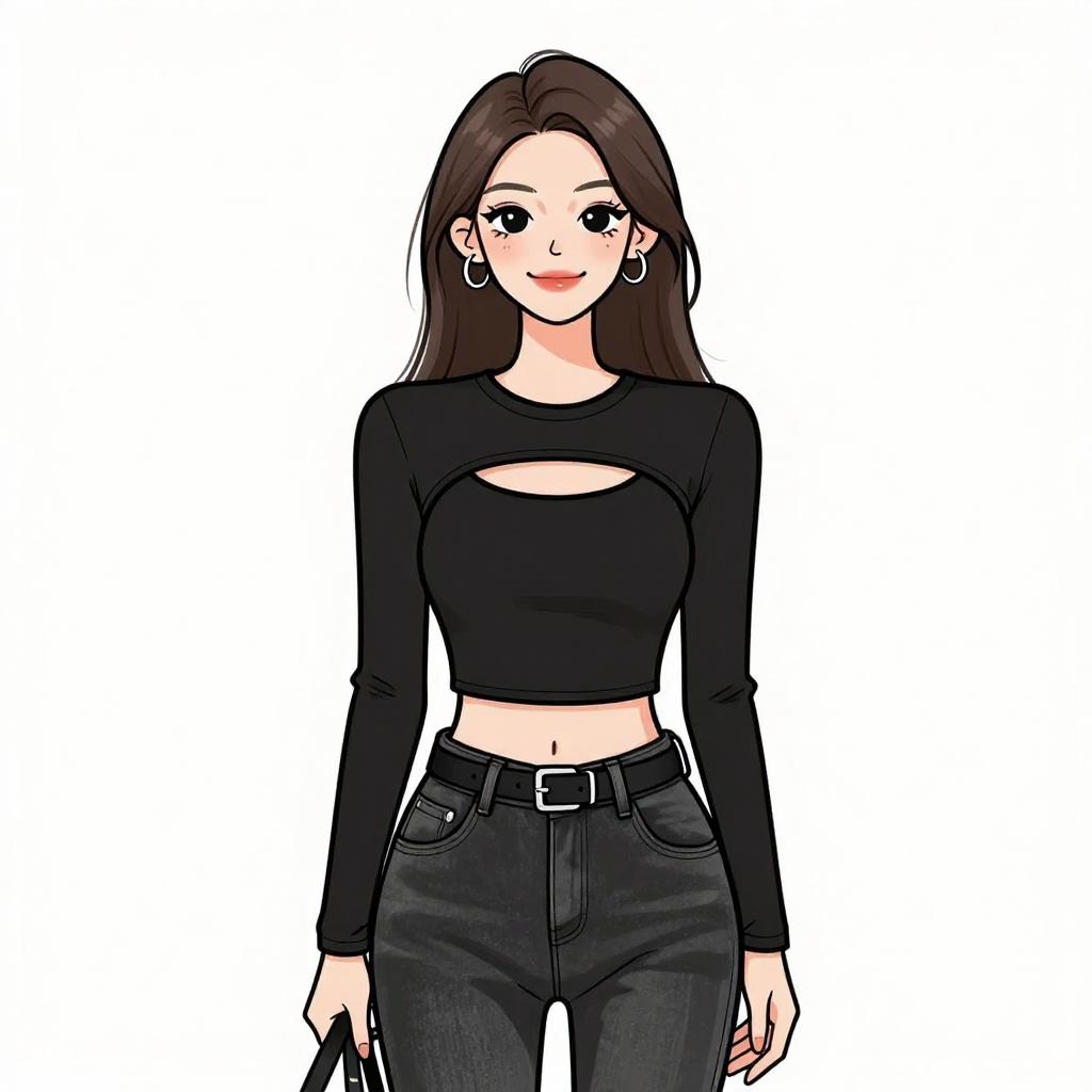 This digital drawing depicts a young woman with fair skin and long, dark brown hair. She has large, expressive brown eyes and a slight smile. She wears a light beige, spaghetti-strap tank top that reveals her slender arms and a double-strand pearl necklace. Her high-waisted, blue jeans fit snugly, showcasing her slim waist and hips. The background is plain white, highlighting the character. The art style is reminiscent of anime or manga, with clean lines and a slightly exaggerated, cute aesthetic.