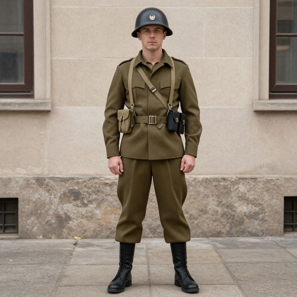 "World War Soldier Costume, man in uniform standing in front of a building"