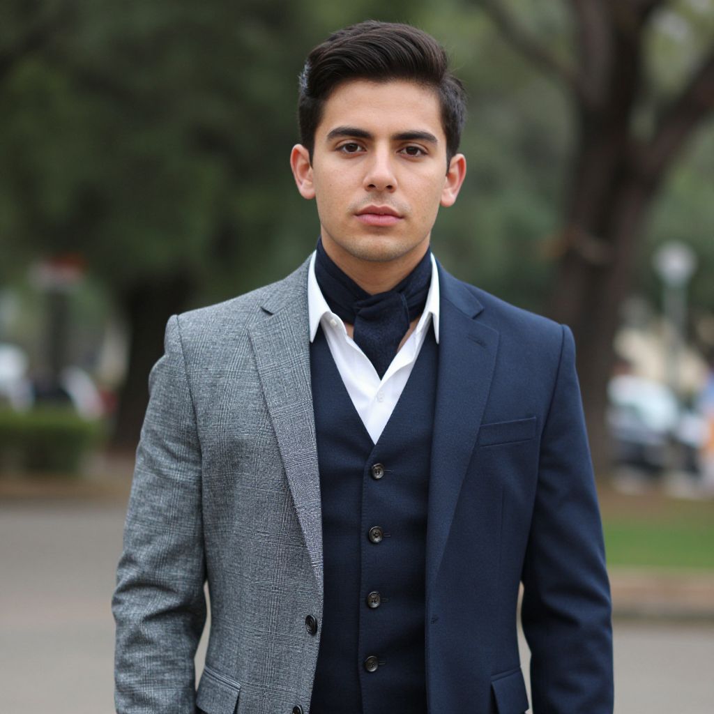 Photograph of a young man standing outdoors, slightly blurred background with trees and a park. He has short, dark brown hair and light olive skin. He wears a black three-piece suit with a white collared shirt, black tie, and a grey herringbone jacket. His expression is neutral, with slightly parted lips. The suit's texture is smooth, and the jacket has a subtle pattern. The background is out of focus, featuring greenery and hints of light from the park. The overall style is modern and formal.