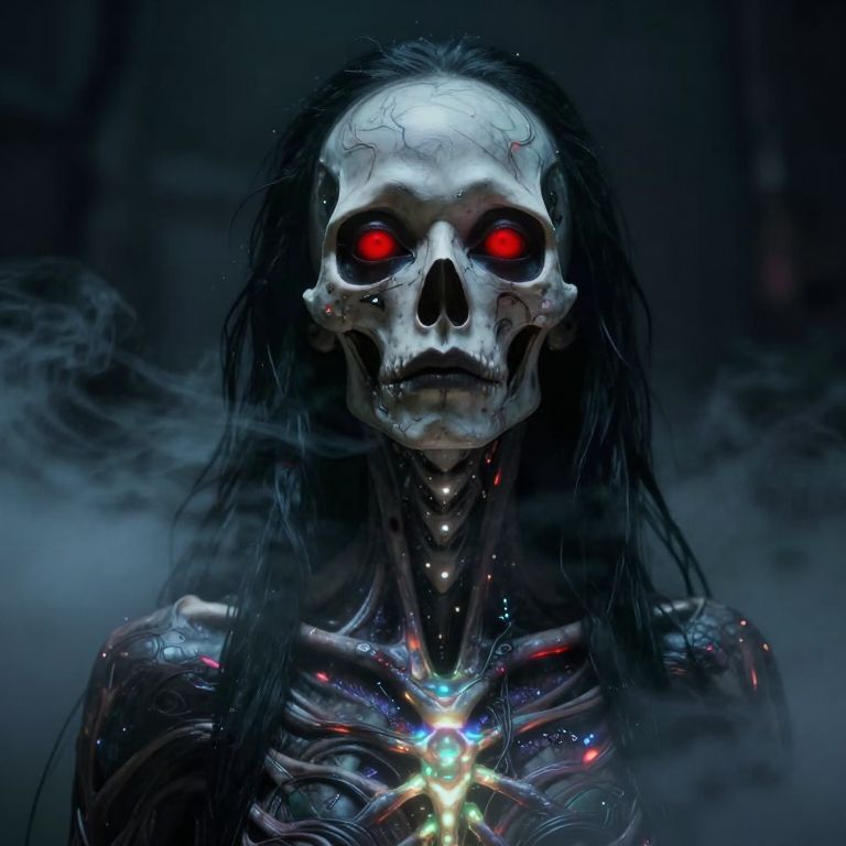 Digital art of a skeletal figure with glowing red eyes, long black hair, and a futuristic, glowing cross necklace, set against a dark, smoky