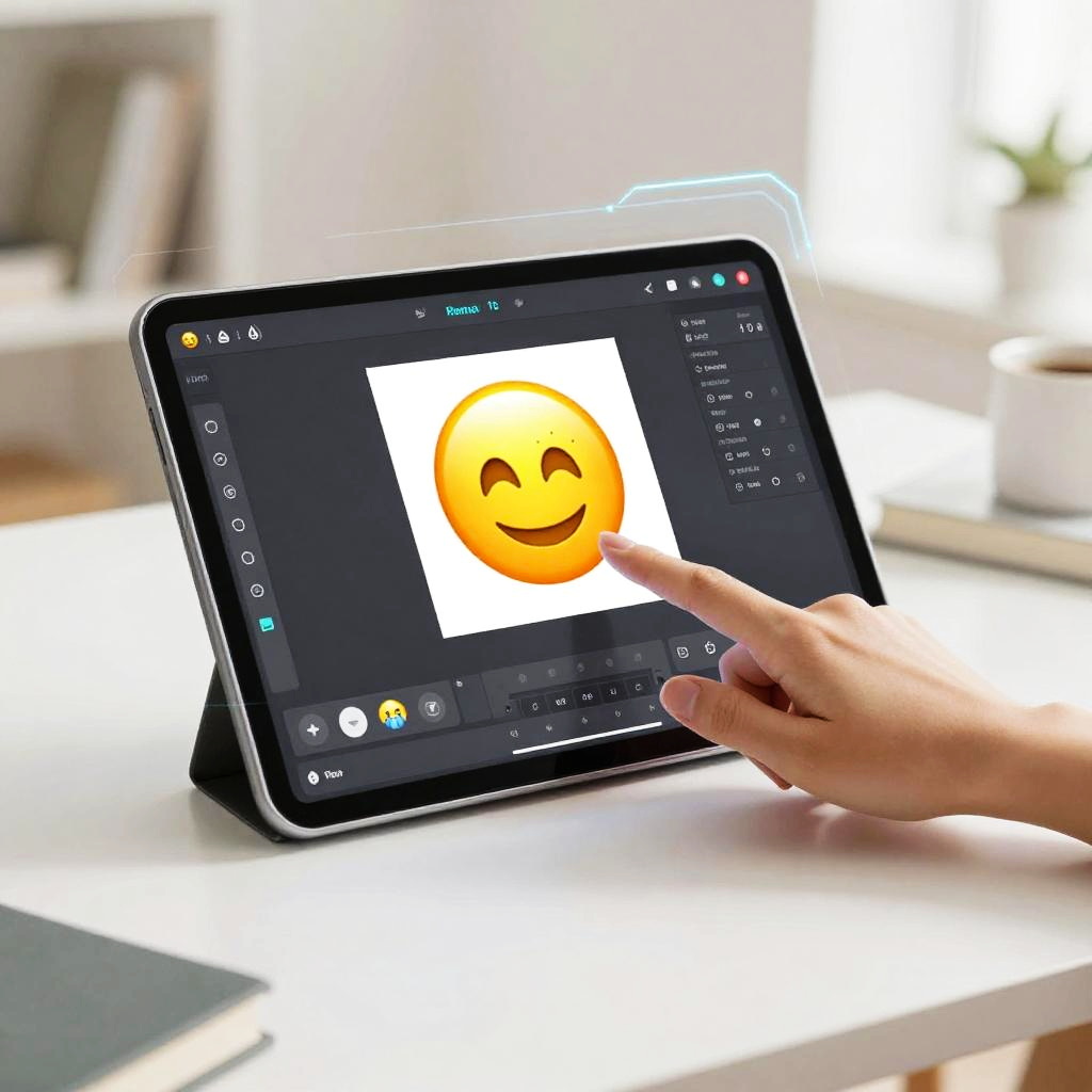 Emoji remover from photo concept, a realistic digital tool interface on a futuristic holographic screen, bright UI elements, user interacting with photo editing on a transparent tablet, clean modern workspace, soft natural lighting, high detail