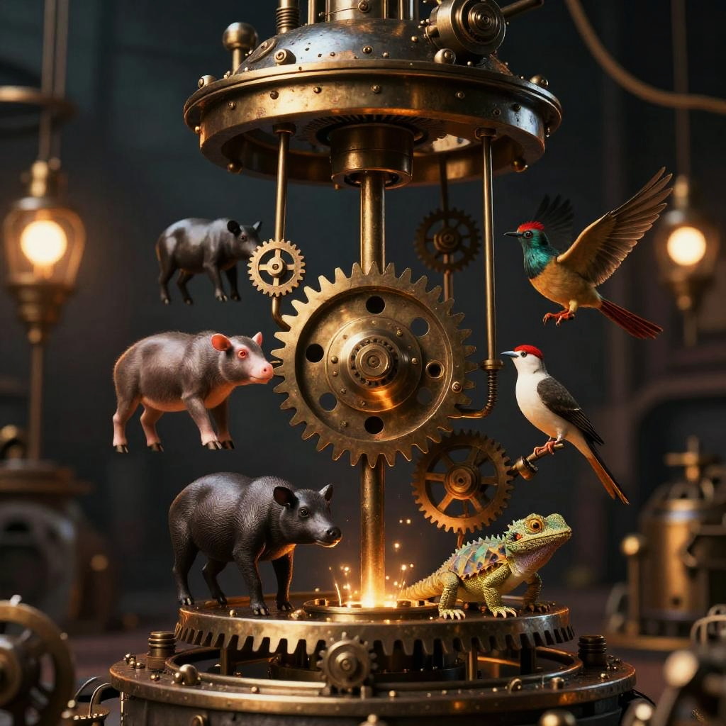 Close-up of an animal mixer generator device, metallic gears and tubes merging mammals, birds, and reptiles into new species, steampunk aesthetic with glowing elements, detailed mechanical complexity, dark industrial backdrop with flickering lights.