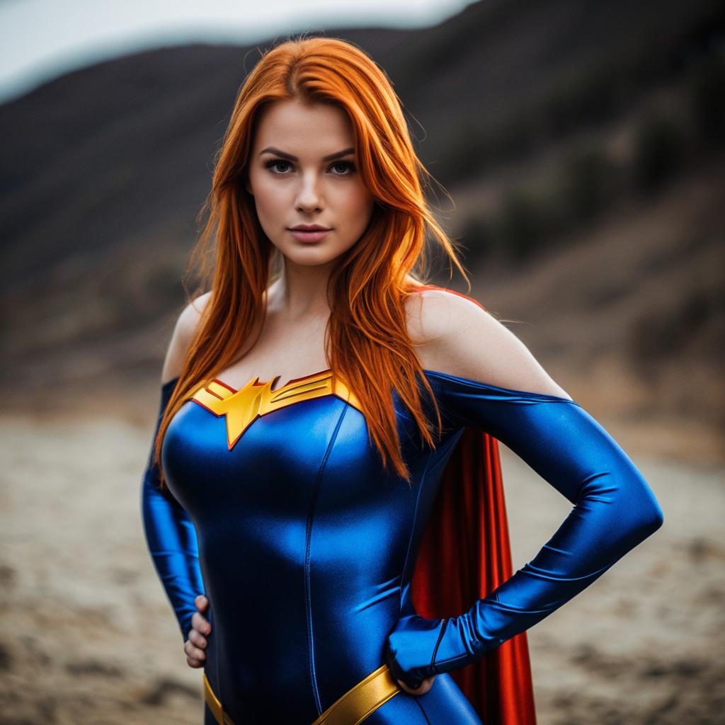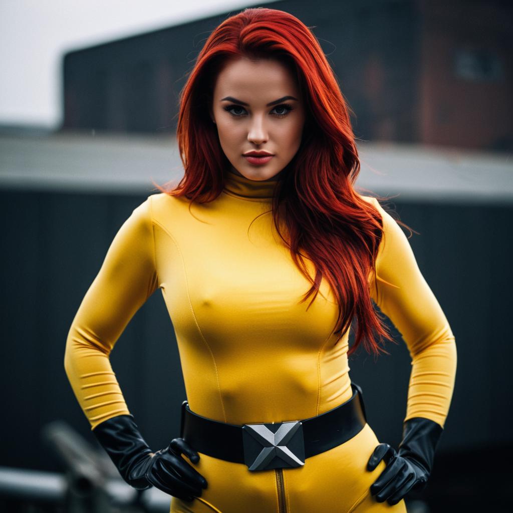 Portrait of a woman with long red hair wearing a tight yellow bodysuit and black gloves. She has a confident expression and stands with hands on hips against a blurred urban background. The outfit includes a black belt with a square silver buckle.