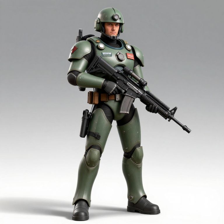 CGI image of a green-armored soldier with helmet, holding a rifle, standing against a gray gradient background. American flag patch on shoulder. Real