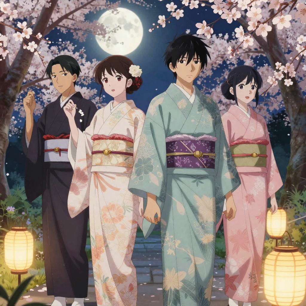 Elegant anime characters in a serene Japanese tea house setting, traditional attire with subtle modern touches, calm and composed poses, surrounded by minimalist décor and lush greenery, soft light filtering through paper windows, delicate brushstroke style.