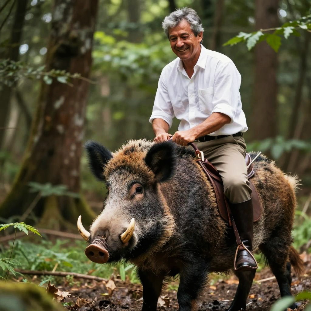 A photo of a middle-aged man with gray hair, wearing a white button-down shirt and beige pants, riding a large wild boar through a lush, green forest. The man is smiling, gripping the boar's bristles with both hands. The boar looks determined, with its ears perked up and tusks visible. The background is blurred with dense trees and sunlight filtering through the leaves.