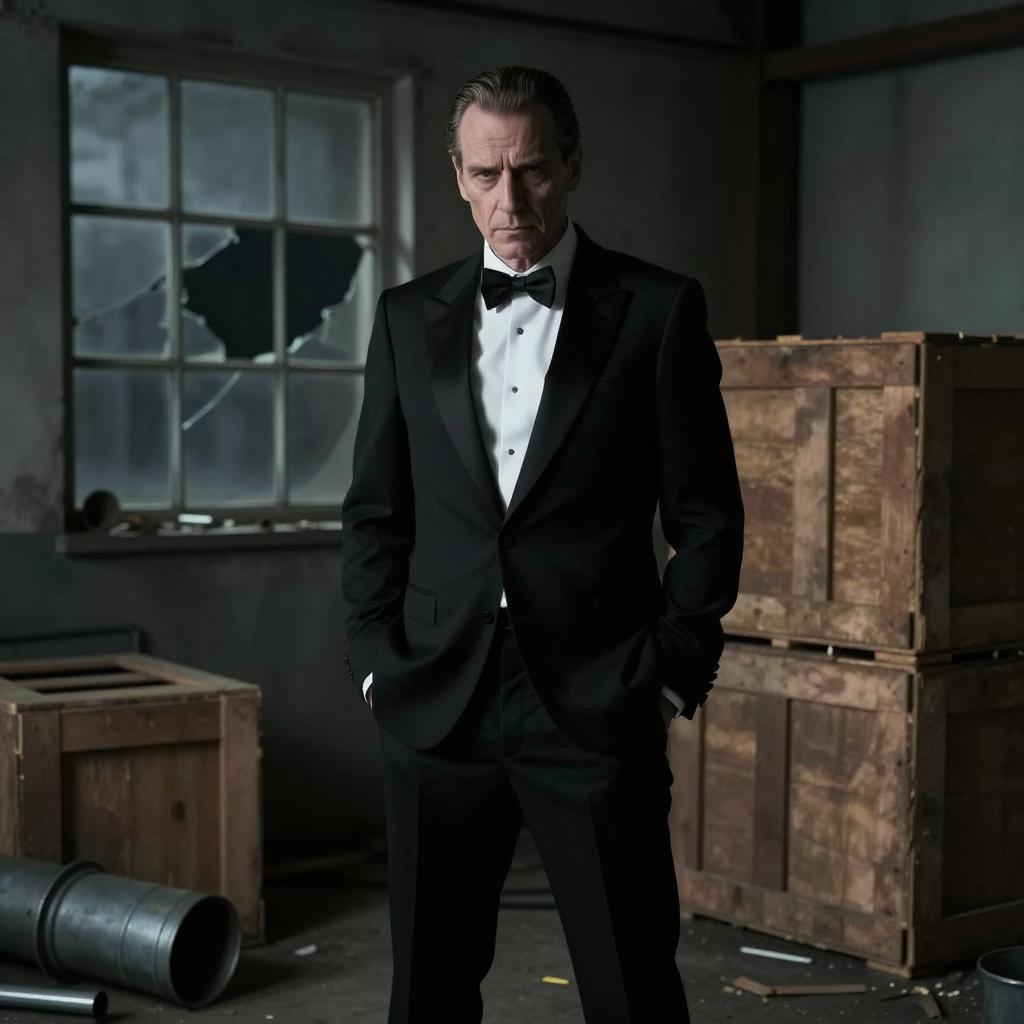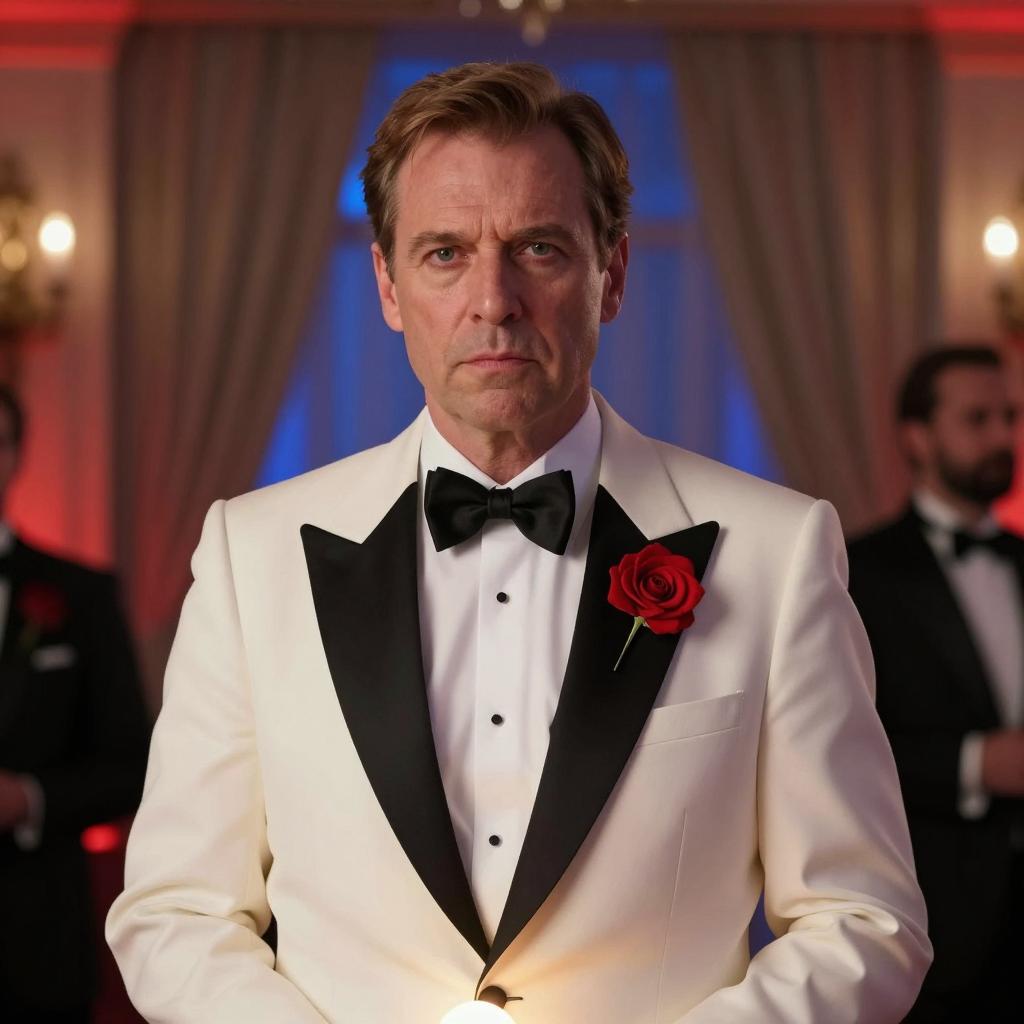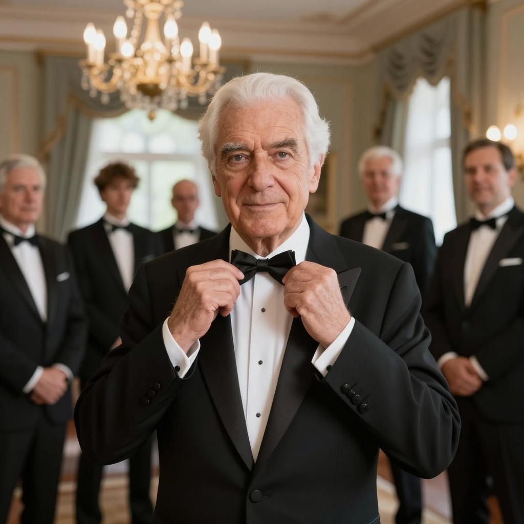 Middle-aged white man with gray hair in black tuxedo, white shirt, black bow tie, adjusting his bow tie in elegant room. Background: group of people in formal attire, including women in dresses, men in tuxedos, chandelier, ornate walls. Man's expression intense. Wooden floor, upholstered chairs. 6 people in background.