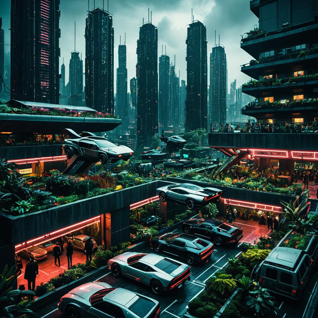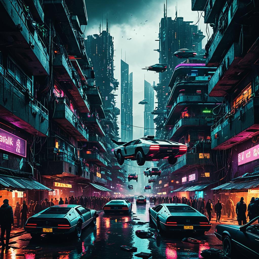 A futuristic cyberpunk cityscape featuring a sleek floating sports car with bright neon lights hovering above a crowded street. Towering skyscrapers adorned with glowing neon signs in vibrant pink and blue hues surround the bustling crowd below. The scene blends advanced technology with a dark, moody atmosphere inspired by Cyberpunk Edgerunners style.