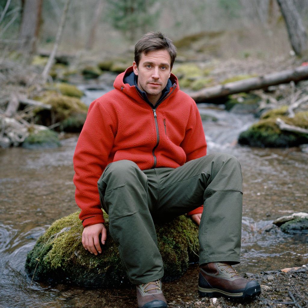 A man, color-blocked zip-up jacket, orange and teal fleece, moisture-wicking sleeveless top, vintage plaid running shorts, classic retro trainers, cozy cabin, nestled in pine trees, lake view at sunset, ib technicolor film stock, relaxed smile, enjoying the moment. Man has masculine face and piercing eyes