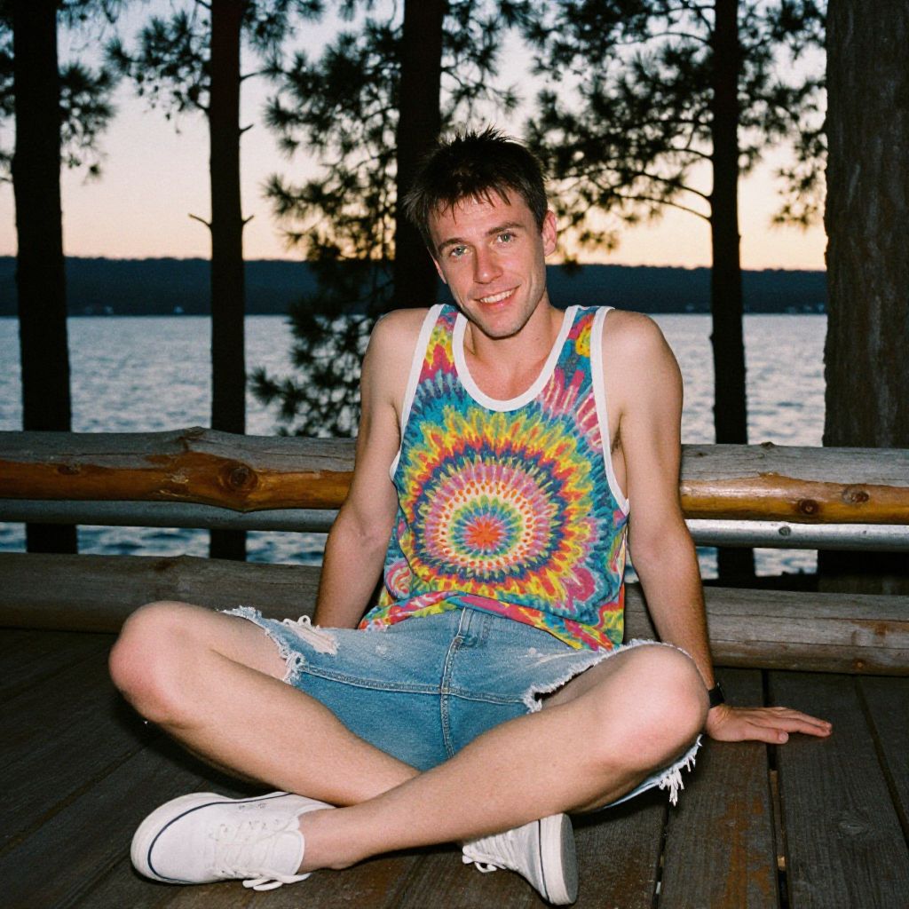 Photograph of a Caucasian man with short brown hair and a light beard, sitting on a wooden bench in a forested area at sunset. He wears an orange and teal fleece jacket, plaid shorts, and blue and white sneakers with orange accents. He has a relaxed smile and is leaning back on his right hand, with his left leg bent and his right leg extended. Tall trees and a lake with a glowing sunset are in the background, creating a serene, natural setting. The bench is made of dark wood.