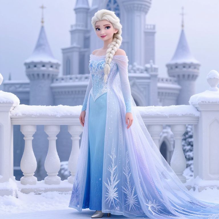 Digital CGI of Elsa from Frozen, in an icy blue off-shoulder gown with snowflake patterns, standing in front of a snow-covered castle.