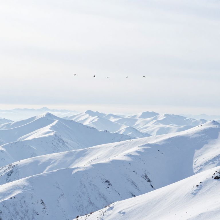 An ethereal expanse of snow-covered peaks stretches endlessly, their pristine folds inviting contemplation of solitude and freedom, while the silhouettes of soaring birds trace paths of hope against the infinite horizon.