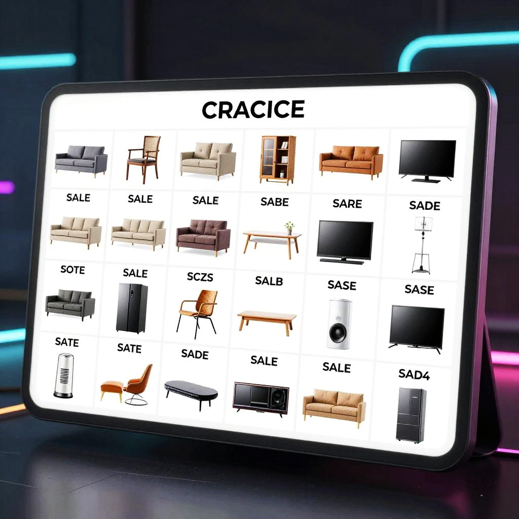 Craigslist inspired collage showing a montage of categorized items for sale, from furniture to electronics, arranged artistically on a digital screen, sleek modern style, glowing neon highlights, futuristic yet familiar atmosphere, dynamic composition