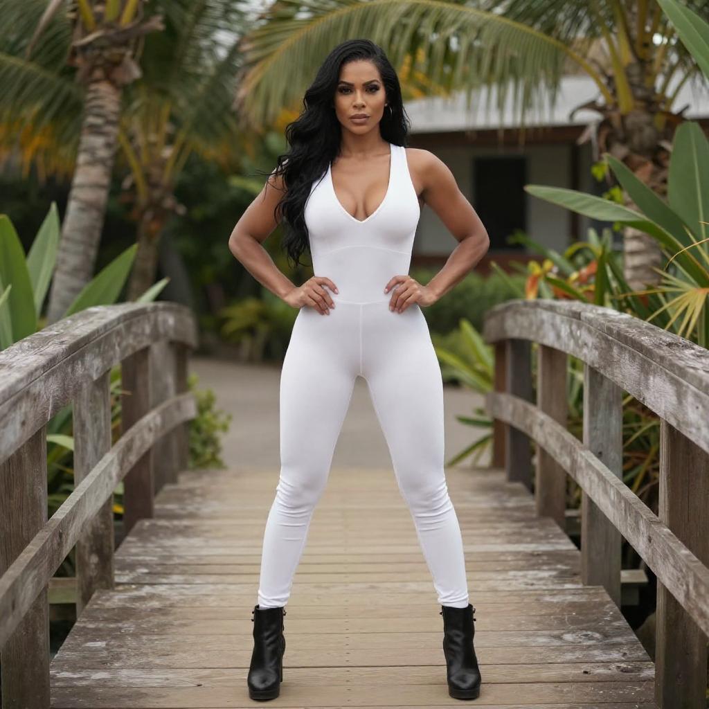Photograph of a muscular, tan-skinned woman with long, curly dark brown hair, kneeling on wet, rocky terrain by the ocean. She's wearing a black, long-sleeved one-piece swimsuit with a red spider emblem on the chest. The background shows crashing waves and a cloudy sky. Her intense expression and confident pose highlight her athletic build and striking presence.