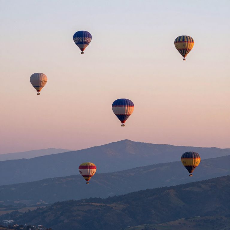 Photograph of seven colorful hot air balloons floating in a serene, early morning sky. The balloons are striped in various patterns of red, blue, and yellow. They are arranged in a loose diagonal line from the bottom left to the top right of the image. The background features a gradient sky transitioning from pale pink to soft blue, with silhouetted mountain ranges in shades of dark blue and purple below. The mountains have a gentle, rolling texture with occasional patches of light and shadow. The overall atmosphere is peaceful and picturesque, highlighting the contrast between the vibrant balloons and the tranquil landscape.