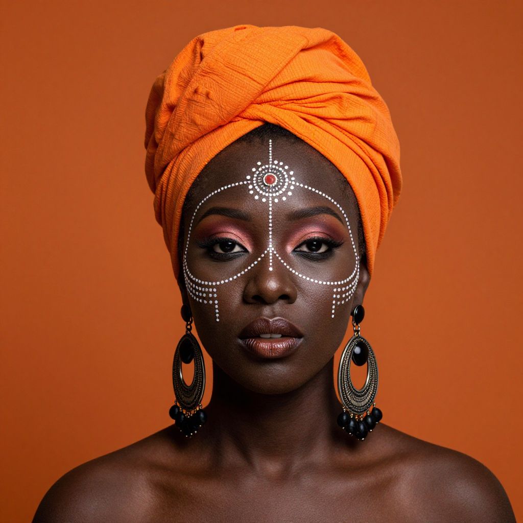 A surreal depiction of a female African woman with intricate facial and headpiece designs, wearing large earrings and a vibrant orange head wrap, set against an orange background.