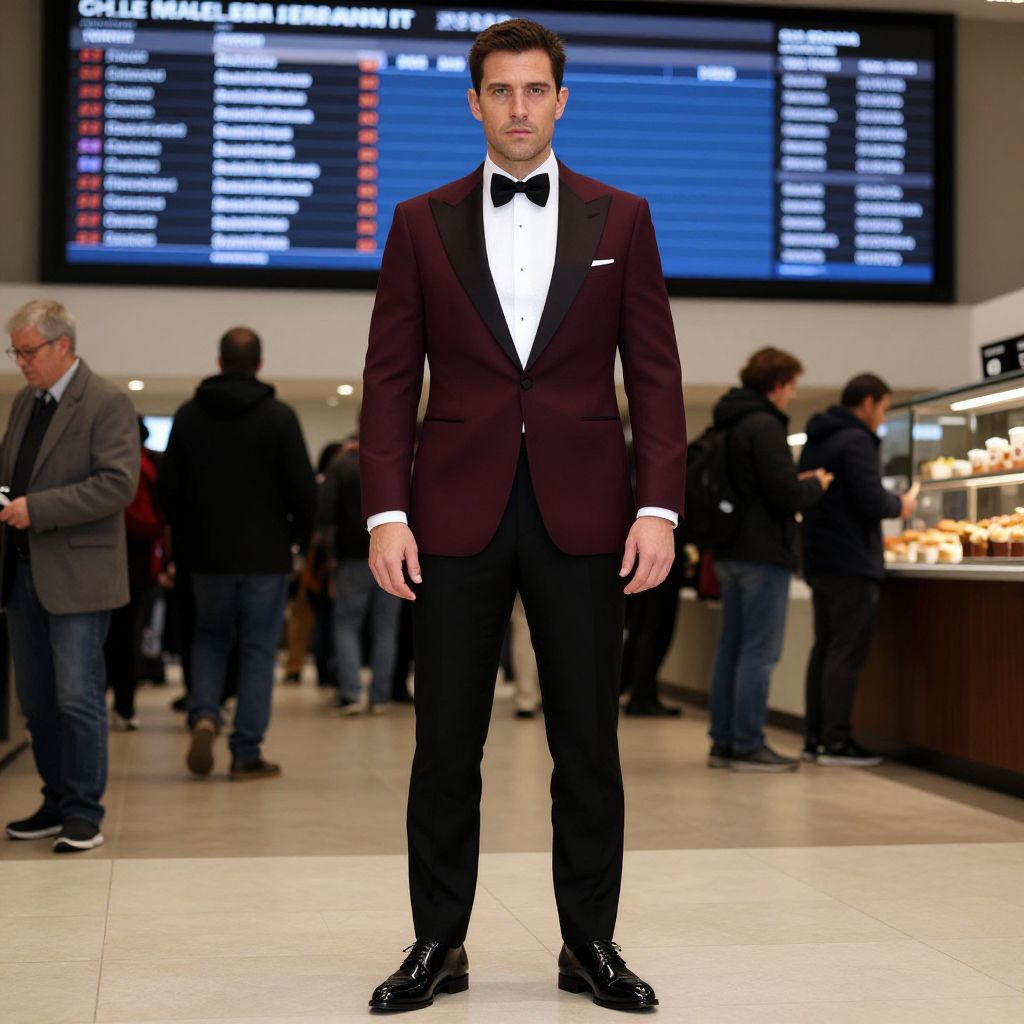 A man, burgundy shawl collar tuxedo, white textured dress shirt, black silk bow tie, fitted black trousers, glossy black monk strap shoes, terminal bustling with travelers, bright digital flight boards, aroma of coffee and pastries, disposable camera style, confident expression. Man has masculine face and piercing eyes