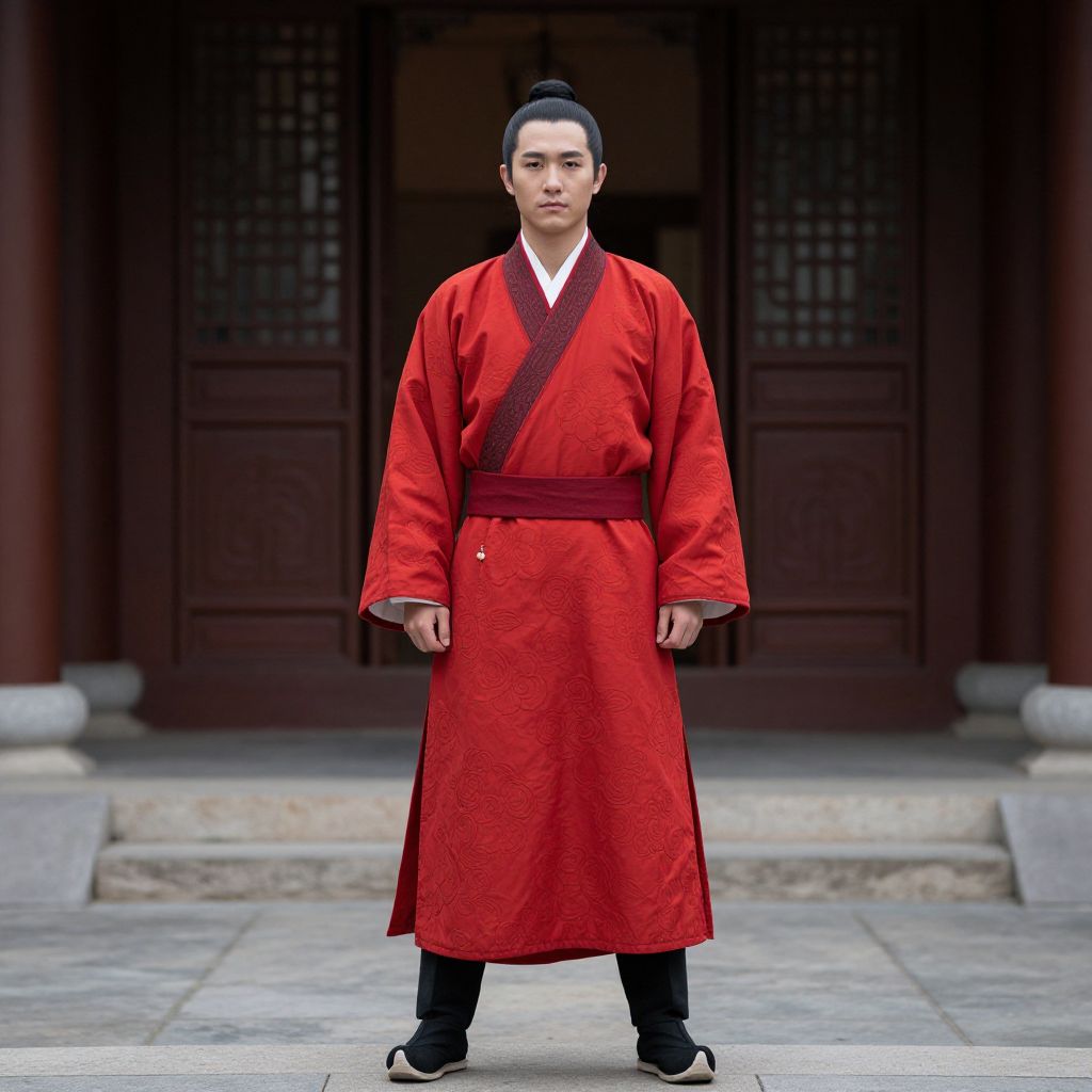 Photograph of a serious Asian man in a traditional red Korean hanbok with black trim, black hair in a topknot, standing in front