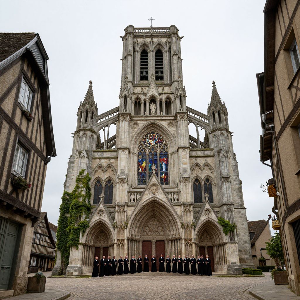 An expansive grand cathedral towering over a peaceful medieval town, surrounded by cobbled streets and tall wooden houses, with a large bell tower chiming in the distance; the cathedral's stained glass depicts scenes from the Bible, and the interior shows a choir of men in black robes singing softly; the exterior is covered in ivy and weathered stone, with a realistic touch of moss and cracks on the walls.